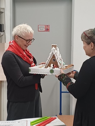 Am 09. Dezember war es dann so weit und die Innungsobermeisterin konnte die Spende in Höhe von 1.000,00 € an Frau Verzino, Leiterin der Spendenbetreuung des Kinderhauses Pusteblume, übergeben. Und passend zur Jahreszeit gab es noch ein buntes und süßes Lebkuchenhaus von der Innungsobermeisterin dazu.